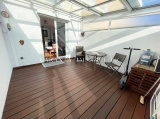 Il se compose: d'une entrée par le patio de 14m² avec couverture en verre motorisée, 1 séjour climatisé avec placards, 1 cuisine séparée dans la véranda (7.40m² hors loi Carrez). A l'étage: 1 salle de bains, 1 WC Séparé, 1 chambre climatisée, 1 chambre en mezzanine de 17.28m² hors loi Carrez avec escalier escamotable par la chambre. 1 place de parking privative, résidence avec piscine. Double vitrage, climatisation et volet roulant électrique. Faibles charges.