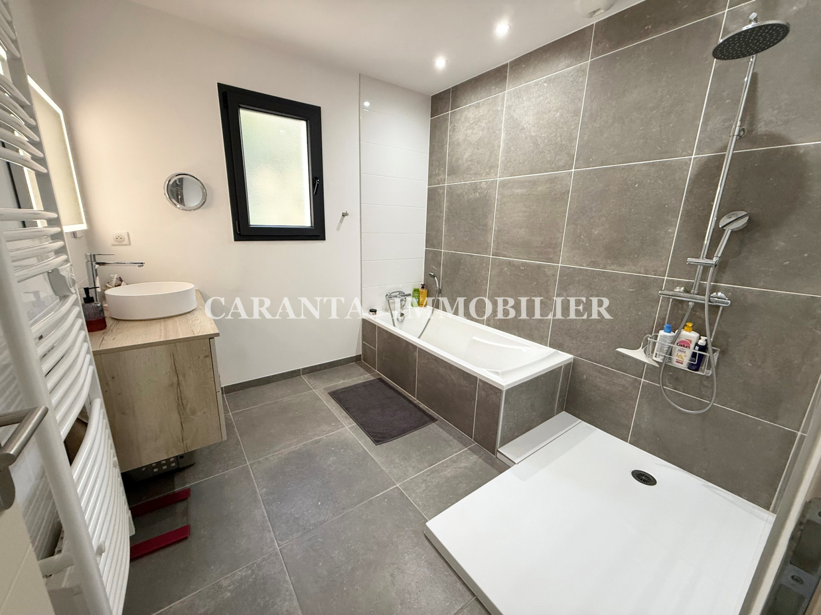 Étage: L’espace nuit offre 3 chambres climatisées avec placards intégrés, une salle d’eau complète avec douche et baignoire, WC séparés.