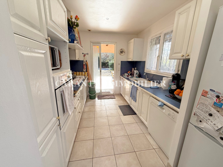 Elle se compose d'une entrée avec placard, 1 séjour lumineux avec cheminée ouvrant sur le jardin, 1 cuisine ouvrant sur la terrasse couverte de 32m², 1 chambre de plain pied avec salle d'eau, 1 WC. A l'étage: 2 chambres dont une grande parentale, 1 salle de bains, 1 WC. Nombreux stationnements.