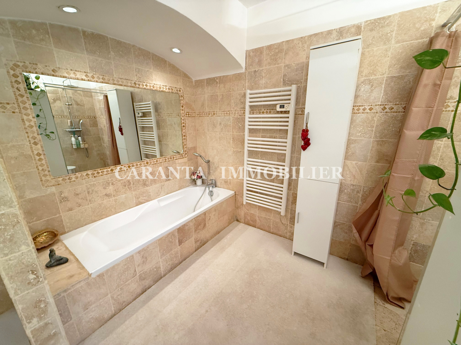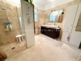 Elle se compose: 1 entrée, 1 grande cuisine indépendante, 1 belle pièce de vie climatisée de 43m² avec cheminée ouvrant sur la terrasse couverte et découverte, 1 suite parentale climatisée de 15m² avec placards, 2 chambres avec placards, 1 salle de bains baignoire et douche en Travertin, 1 WC séparé, 1 buanderie.